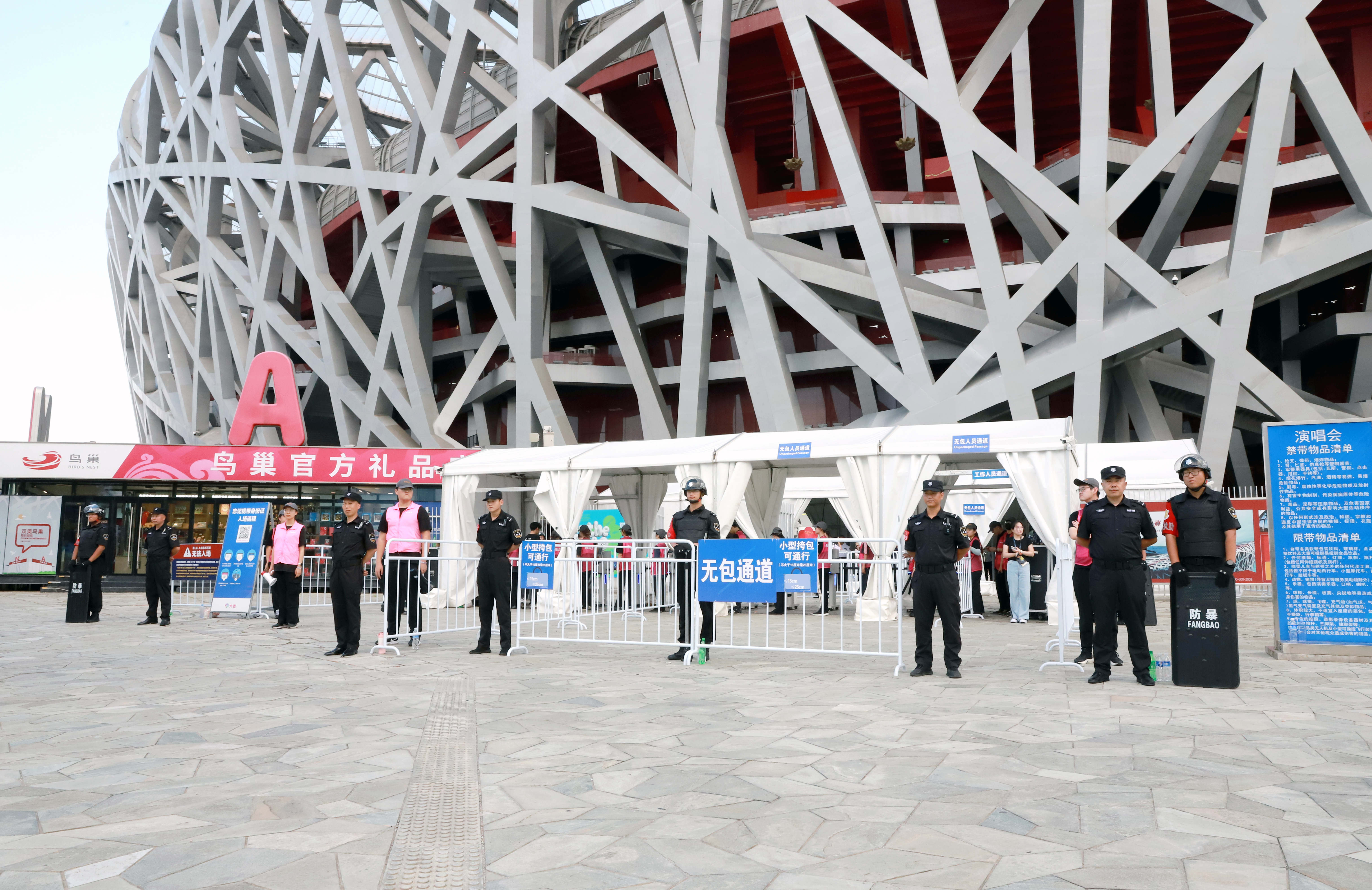 北京保总作为此次演唱会的保安和安检工作签约方,主要承担外围封控区、疏导区观众入场和散场秩序维护、车辆入场查验,观众入场前最后一道安全防线的安全检查等任务。北京保总领导高度重视、统筹协调,主责部门提前实地踏勘、制定详尽的工作预案,共同确保勤务单位管辖区域明确、职责任务清晰。针对可能出现的观众入场时间相对集中、人流密集拥挤的安全隐患,现场指挥部采取事先分析预判与实时监控相结合的安保工作机制,从指挥调度、区域力量协同、现场组织三个维度实施“三级联动”。