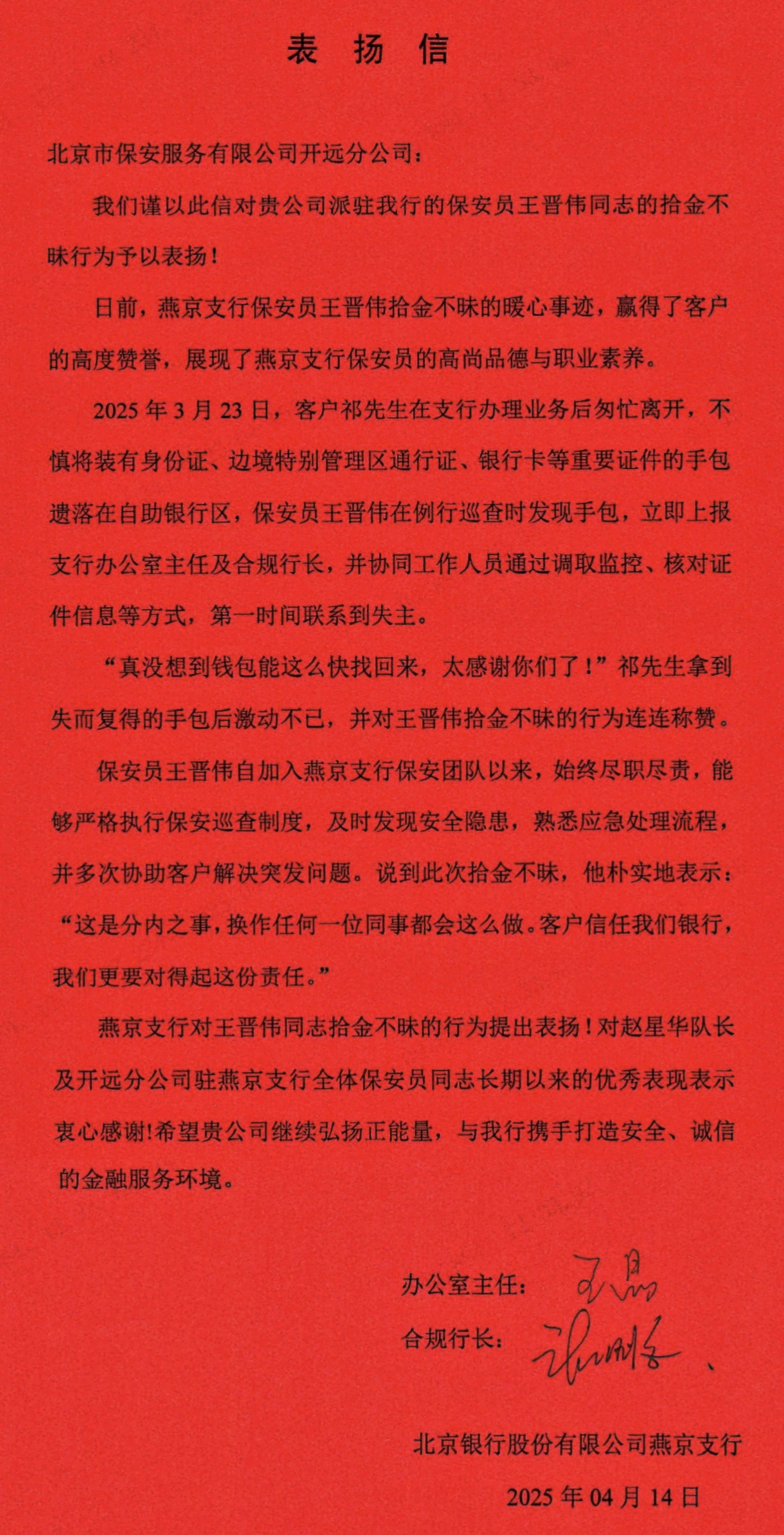 王晋伟,北京保安服务有限公司开远分公司驻北京银行燕京支行保安队队员。2025年3月23日,银行客户祁先生办理业务后,不慎将装有重要证件的手包遗落在自助银行区。王晋伟巡查时发现手包,立即上报,并协助银行工作人员通过调取监控、核对证件信息,迅速联系到失主。此前,他就凭借尽职尽责的工作态度,多次妥善处理突发问题,深受客户单位认可。2025年4月14日,开远分公司收到北京银行燕京支行的表扬信,赞扬王晋伟拾金不昧的高尚品质及团队的优秀表现。