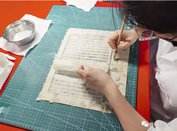走进东城区炮局胡同1号汉龙文献保护中心,修复师们正在全神贯注做着单页纸托背修复,他们用笔在虫洞破损处涂上浆糊,补上纸,再用镊子撕去补纸多余部分,最大程度地将古籍修复成原状。